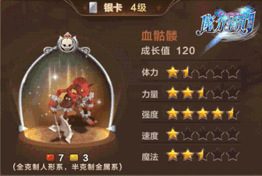 D姐点评:当D姐还是萌新时,一直不明白血骷髅做魔宠的原因呢,直到有一天…四星半的防御成长让它在战斗中能为勇者们提供强有力的保护哟~在PK时,不死系的种族优势也让血骷髅有了更大的发挥空间呐~各位骷髅爱好者们会为它选择怎样的技能搭配呢?